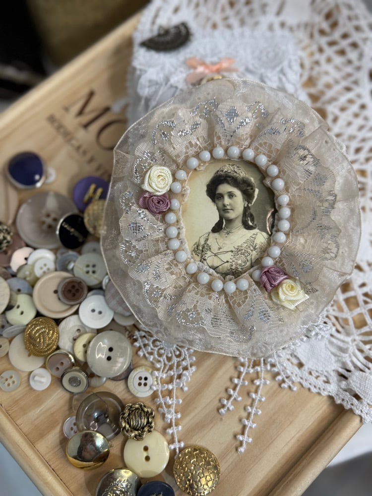 A handcrafted pouch inspired by early 20th-century design and filled with an eclectic mix of genuine vintage buttons. Each pouch is made with delicate period-inspired lace trims & an Edwardian Photograph. Designed as a keepsake, the bag is as beautiful as the contents it holds. Inside, you’ll discover a handpicked assortment of vintage buttons with unique patina, and character.