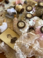 Elevate your creative spaces & desks with this charming aged Wooden Spool. Wrapped in Vintage lace trim, with a pinned mini photograph.