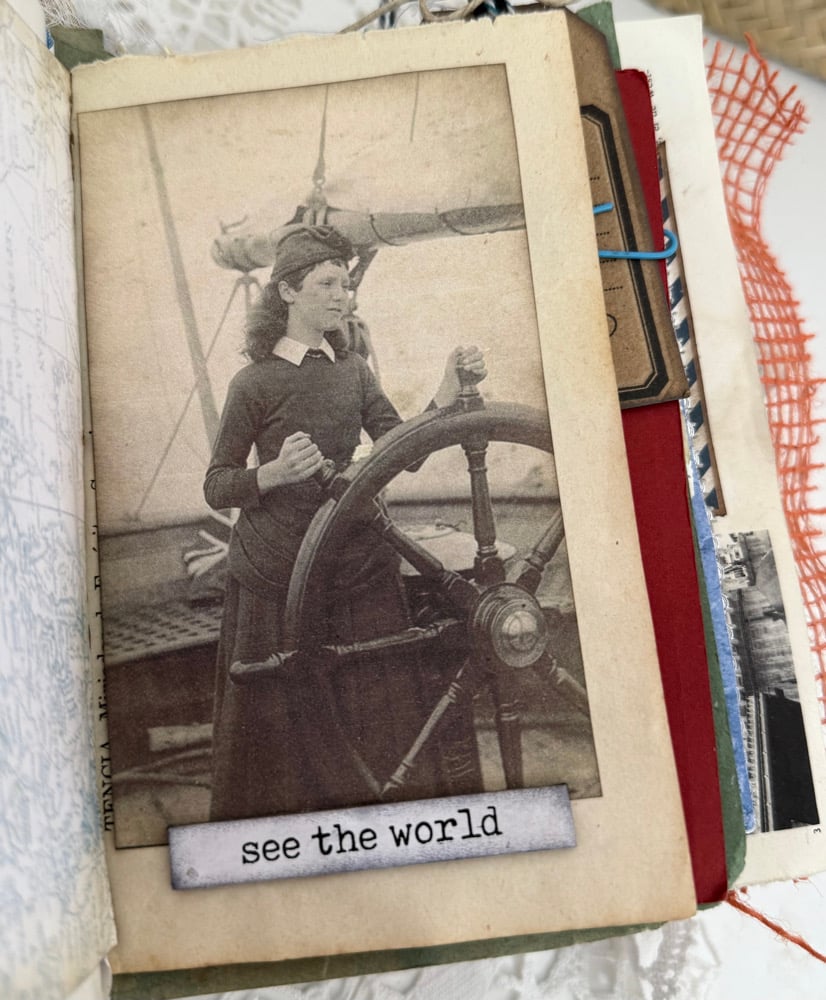 • Handmade Embellishments: Tuck spots and layered pockets are filled with handmade nautical tags, aged papers, and mini envelopes.
