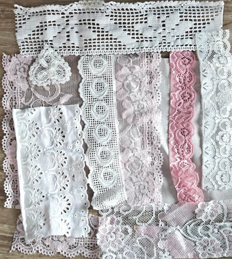 • A mystery mix of lace pieces and trims in various lengths, patterns, and shades.