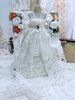 • Elegant Lace-Covered Hardback: The journal cover is wrapped in delicate white bridal lace, adorned with a stunning fabric bodice doll centerpiece dressed in a handmade wedding gown—a beautiful, dimensional focal point.